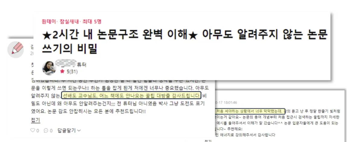 그래서, 2019년도부터 ‘아무도 알려주지 않는 논문쓰기의 비밀’ 수업을 런칭하였습니다. 수많은 피드백들을 반영 수업을 개발해왔고 (지금도 ing), 현재 6년이 넘는 기간동안 1000명이 넘는 대학원생들에게 논문쓰기 꿀팁들을 전수하고 있습니다.